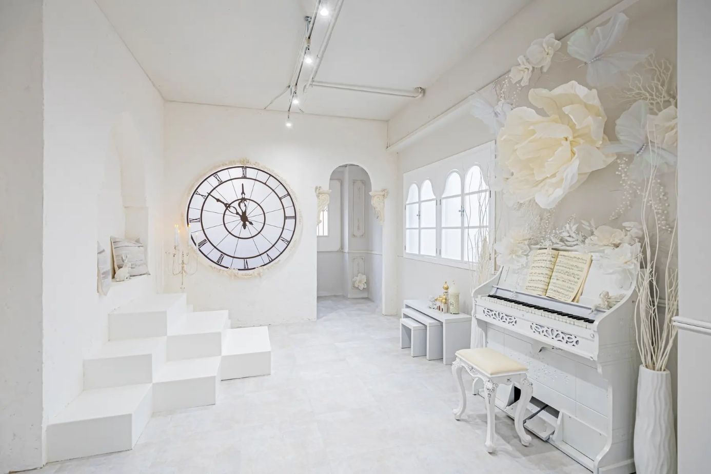 花に彩られた巨大なケーキ、デザイナー製作による時計台のインスタレーション、シルバーの巨大なバタフライ&黒漆喰壁、チャペルのようなアーチや白いオルガンといった素敵なシチュエーションで、あなたをエレガントなフェアリーに変身させちゃいます♪