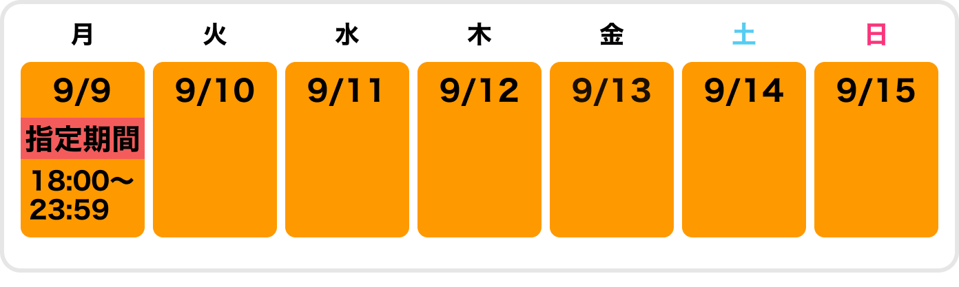 Monday, 09/09/2024 18:00 〜 Sunday, 15/09/2024 21:59