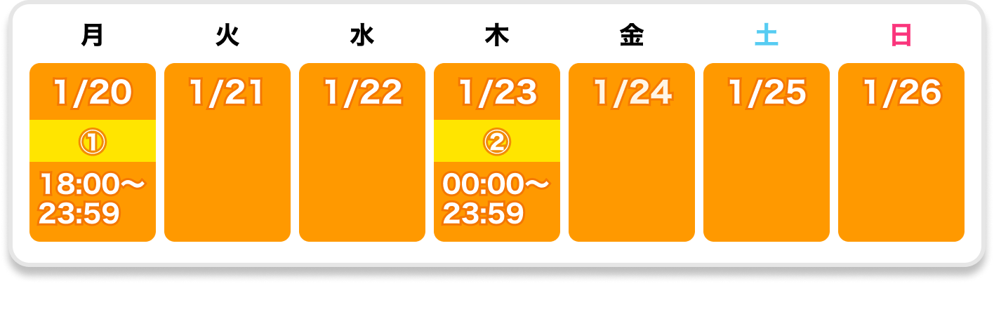 Monday, 20/01/2025 18:00 〜 Sunday, 26/01/2025 21:59