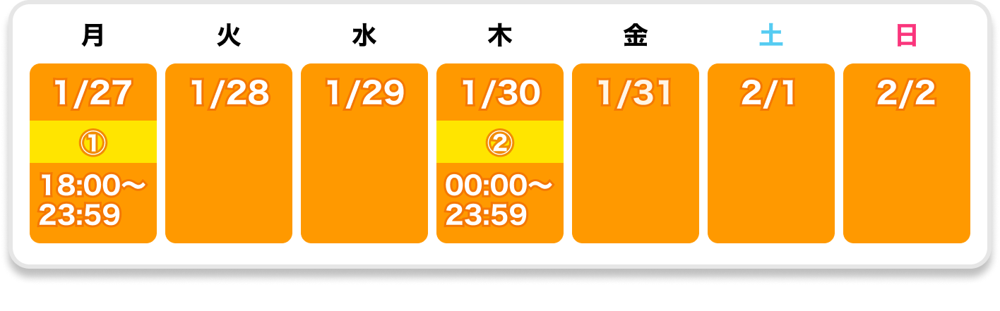 Monday, 27/01/2025 18:00 〜 Sunday, 02/02/2025 21:59