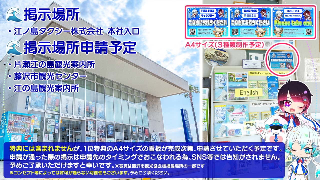 ・本特典で描かれたイラストが#エノタクフリーペーパースペースの看板キャラクターとして、天候不良を除いた営業日の2025/03/17(月)から2025/04/13(日)の間、江ノ島タクシー株式会社本社(https://maps.app.goo.gl/S9kCJs7fi8XCrmTn7)に掲載されます。
