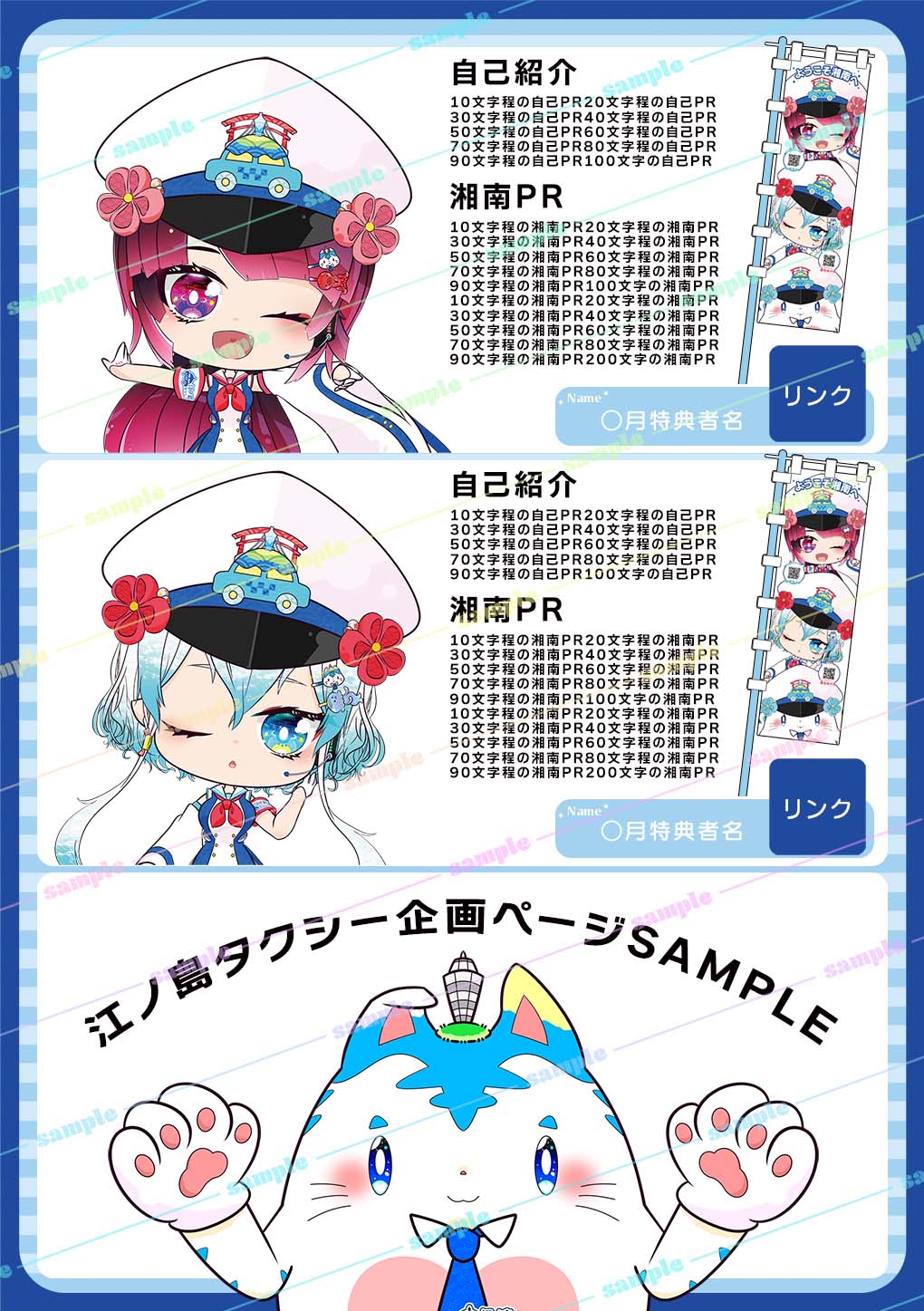 「江ノ島タクシー湘南PR応援大使」を決定するイベントを開催! 応援大使を獲得した方は、江ノ島タクシー株式会社の広報マスコットキャラクター「竜宮海月」「奥津宮アイラ」と一緒に、旅行などで人気の観光地「湘南」をPRするショート動画を宣伝するのぼりに掲示されます!さらにのぼりを1つプレゼント!また、のぼりだけではなく、88Activity(パチパチアクティビティ)の『江ノ島タクシー株式会社の企画ページ掲載』を特典としてご用意!ランキング3位までの方は、フリーペーパー『88Activity(パチパチアクティビティ)』のその他広告枠もご用意してますので、湘南をアピールできるライバー様のご参加をお待ちしております!