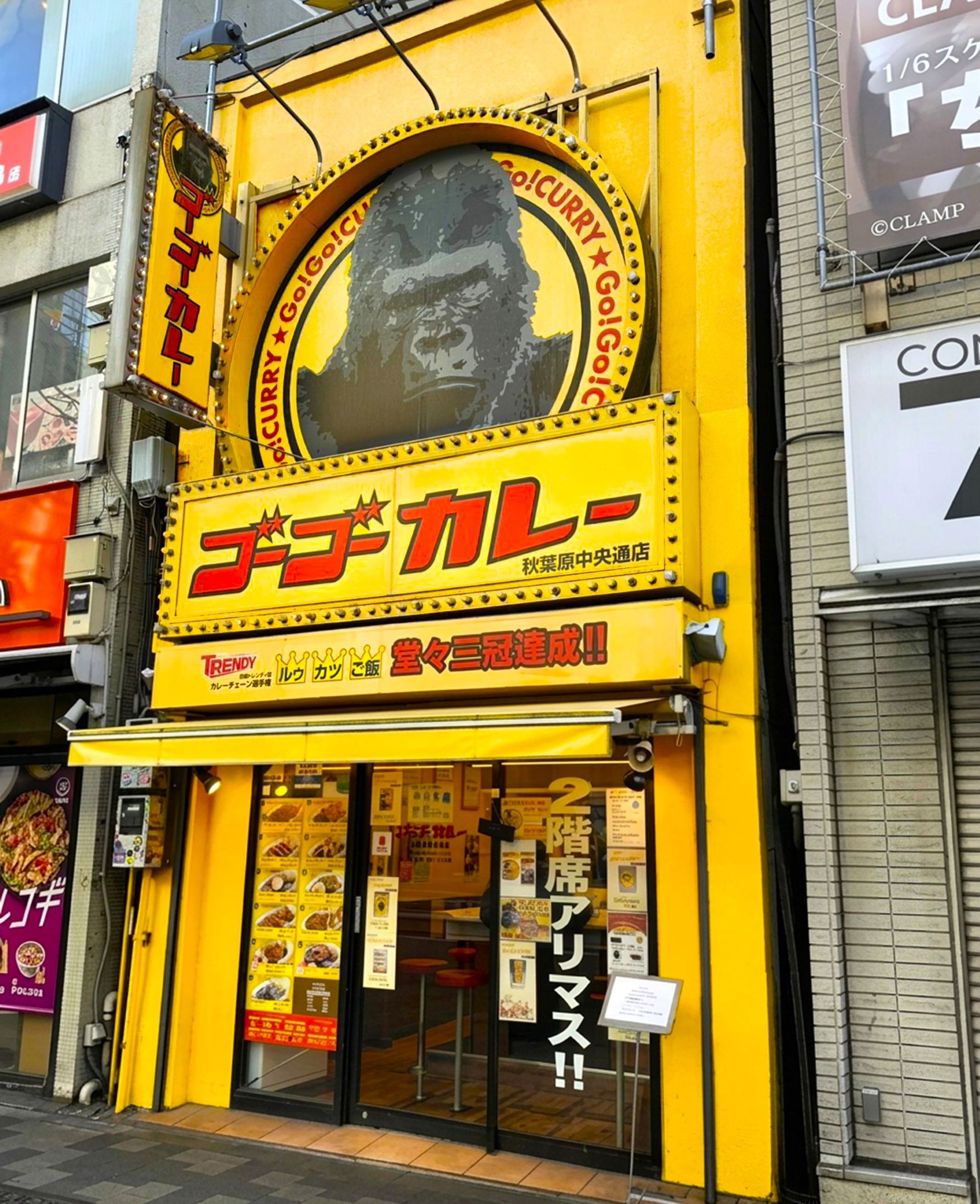 ▼秋葉原電気街のメインストリート・中央通りにある『ゴーゴーカレー』秋葉原中央通店。多くの観光客でごった返す秋葉原でも、この黄色とゴリラの看板はひと際存在感を放っています!