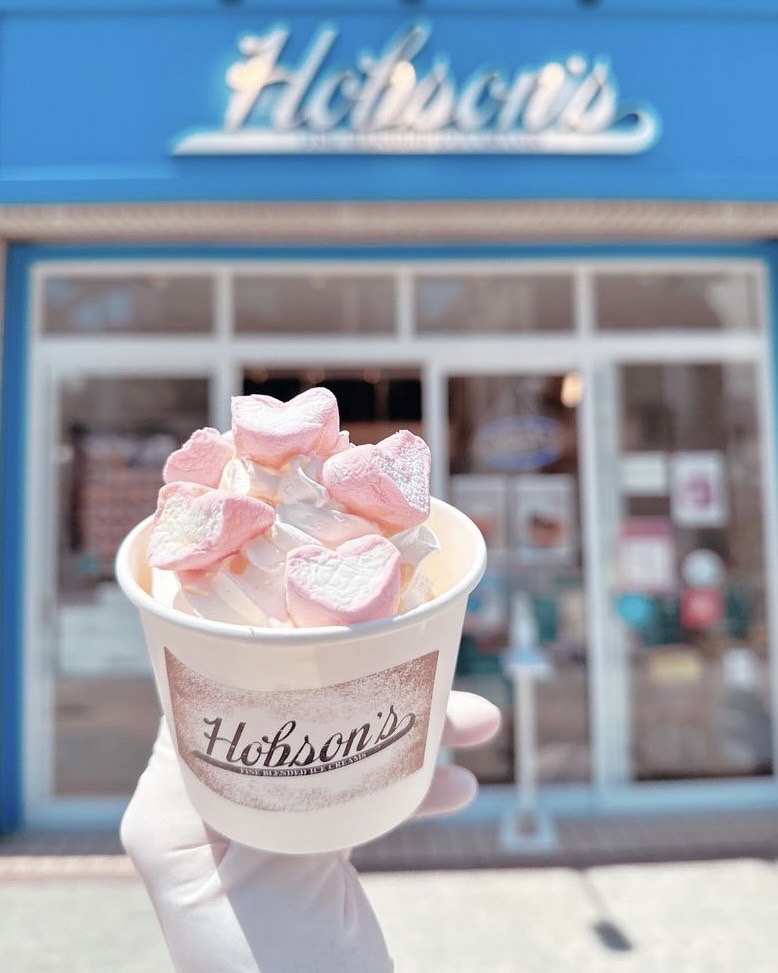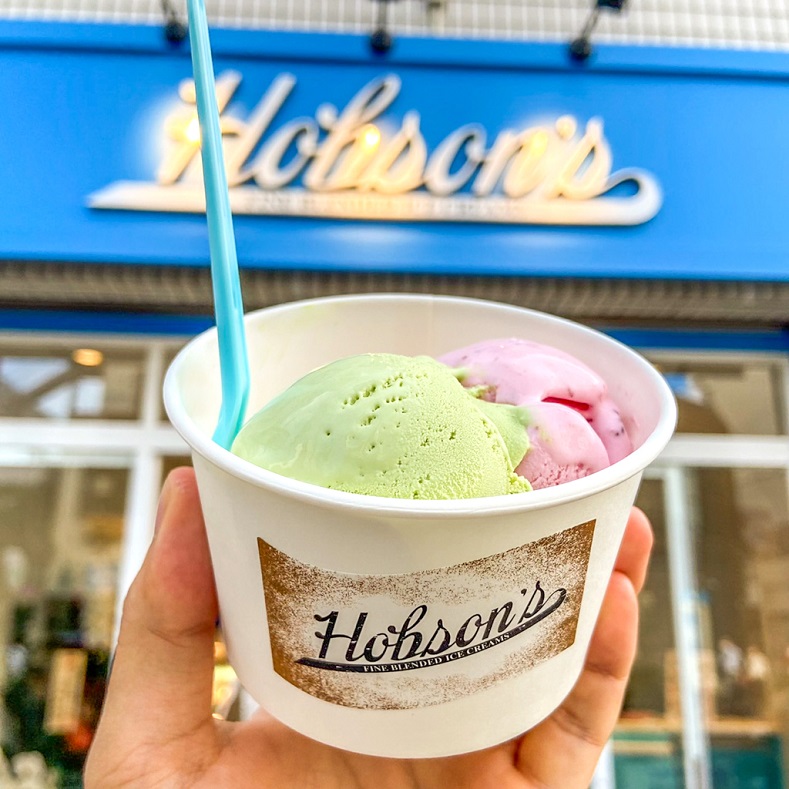 『Hobson's』は、1985年にアメリカ西海岸サンタバーバラから上陸したプレミアムアイスクリームショップのパイオニア。メニューは、アイスクリームとクレープともに季節に合わせて開発されているので、1年を通して多くの方に愛されています。バニラやチョコレート、ラムレーズンといった定番フレーバーはもちろん、厳選されたフレーバーにフルーツやお菓子を専用マシンでミックスし、自分だけのオリジナルアイスクリームができるブレンドアイスクリームも絶大な人気を誇っています。