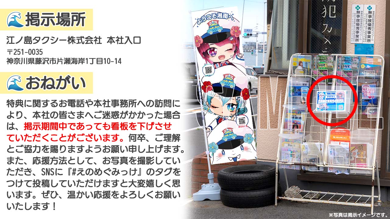 ・本特典で描かれたイラストが#エノタクフリーペーパースペースの看板キャラクターとして、2026/12/15(火)から2027/01/12(火)の間、江ノ島タクシー株式会社本社(https://maps.app.goo.gl/S9kCJs7fi8XCrmTn7)に掲載されます。