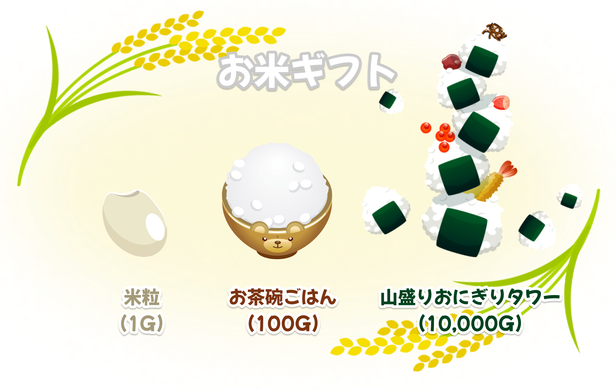 日本人の食に欠かせないもの、お米。 今回は米粒から山盛りおにぎりまで、お米に特化したギフトを用意! ライバーの皆さんは「お米ギフト」をもらった分だけ、配信でも私生活でもお米を食べましょう! お米を美味しそうに頬張るあなたの姿を見て、リスナーさんもきっと幸せな気持ちになるはず♡