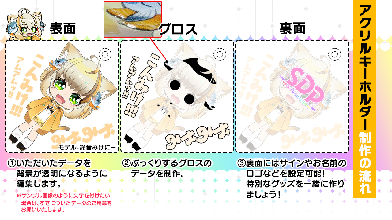 ・2024/05/05(日)23:59までに、グッズ制作に必要な「宣材写真or立ち絵orアバターイラスト」のご提出をお願いいたします。画像データは背景の切り取りなど編集をするため、編集可能なデータのお渡しをお願いいたします。