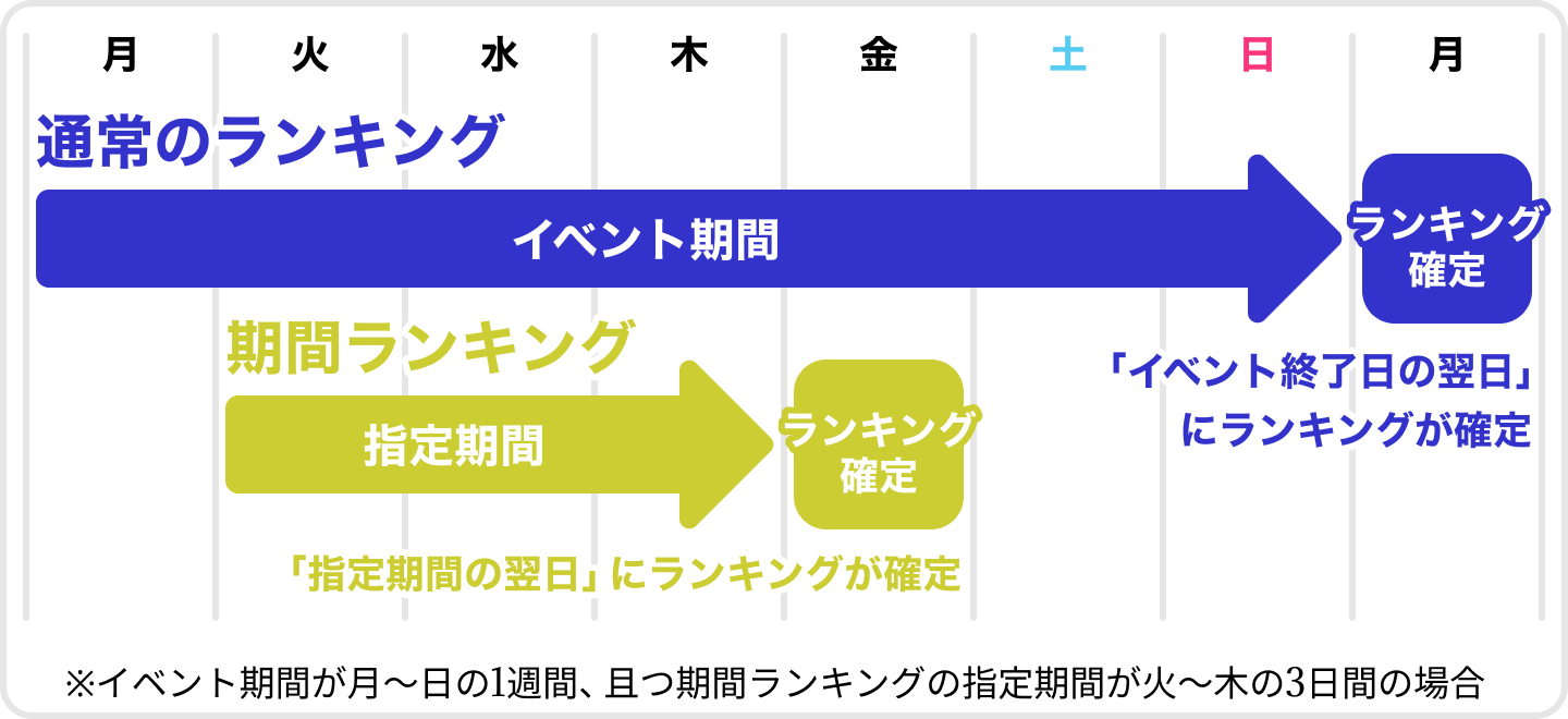 通常、イベントのランキングの結果はイベント終了日の翌日正午以降に決定しますが、期間ランキングでは指定期間の翌日に決定します!