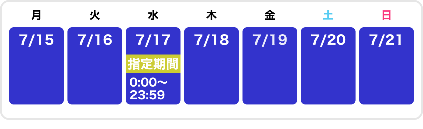 Monday, 15/07/2024 18:00 〜 Sunday, 21/07/2024 21:59