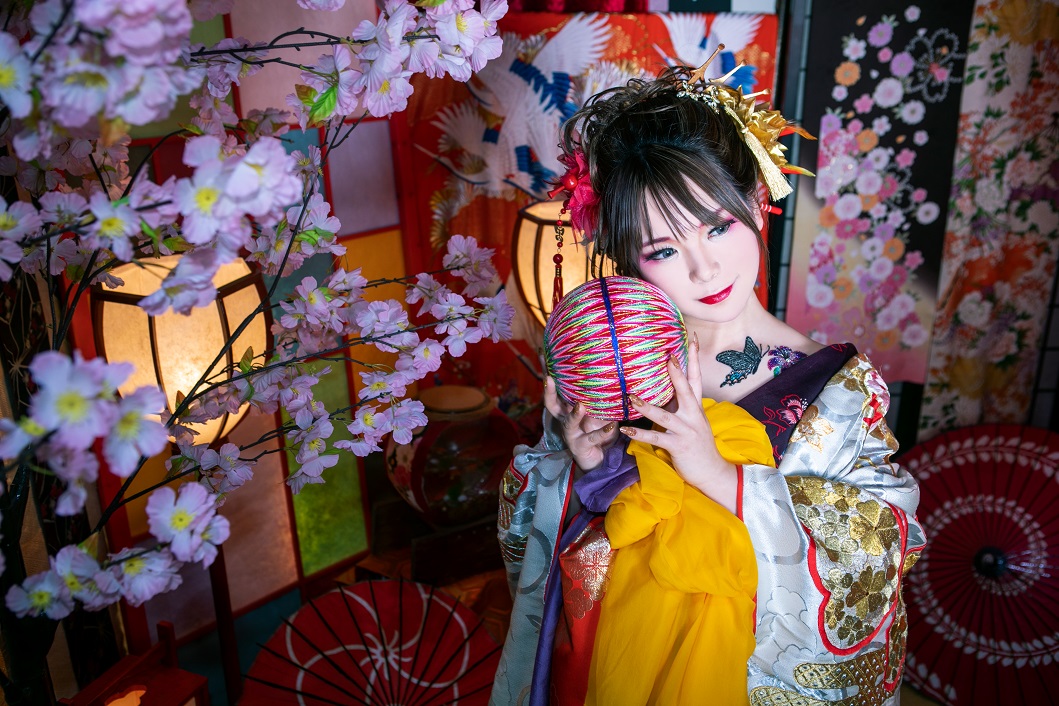 本格メイクに地毛を使ったヘアアレンジで、「現代風花魁」から「本格古典風花魁」までさまざまな花魁姿に変身することができます。