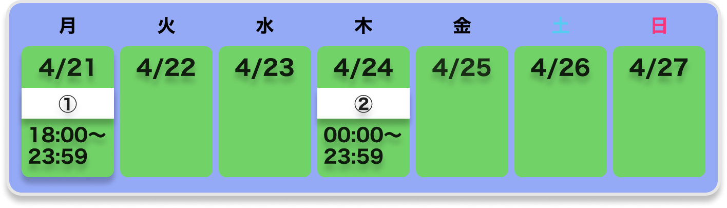 Monday, 21/04/2025 18:00 〜 Sunday, 27/04/2025 21:59