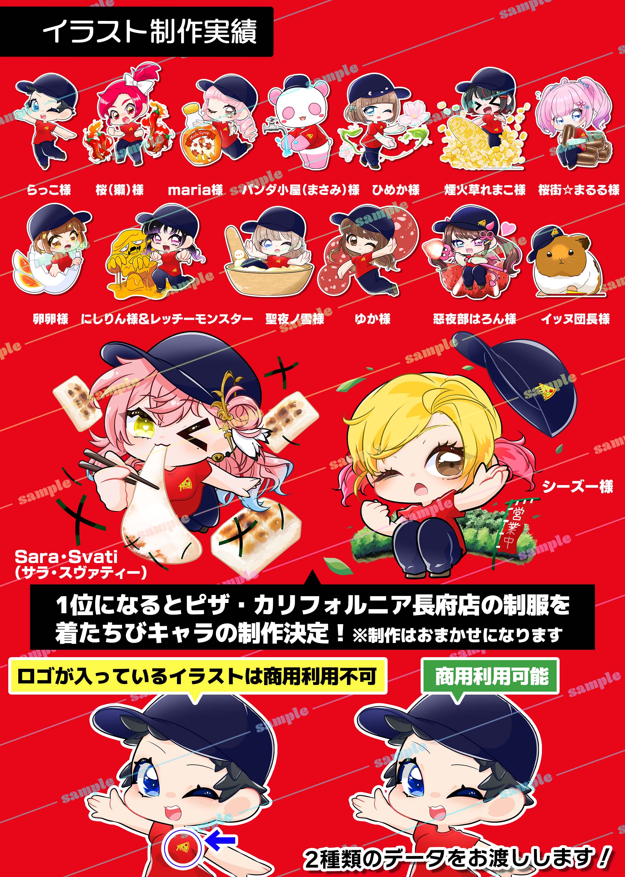選べる生地・ピザの種類・サイドメニューまで豊富な、山口県下関市で愛されている人気店『ピザ・カリフォルニア長府店』の制服を着たアシスタントちびキャライラストを株式会社megumi88worksの萌生めぐみが制作いたします!イラストは、配達用バイクの荷台、店内掲示の売上商品ベスト10に掲載予定!もちろん商用利用可能なイラストもお渡しします!!ランキング3位までの方は、フリーペーパー『88Activity(パチパチアクティビティ)』の広告枠も付いてきますので、ピザが大好きでちびキャラになりたいライバー様のご参加をお待ちしております!