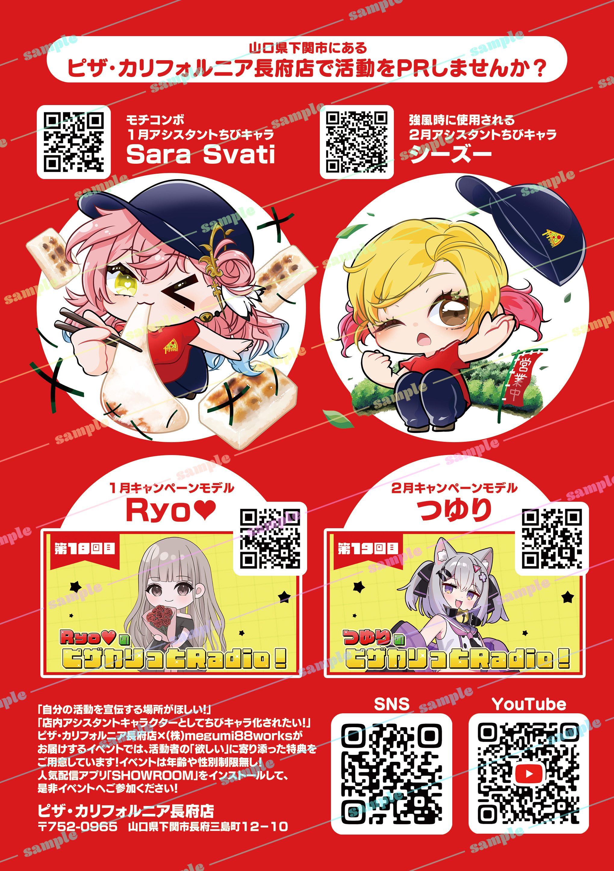 選べる生地・ピザの種類・サイドメニューまで豊富な、山口県下関市で愛されている人気店『ピザ・カリフォルニア長府店』の制服を着たアシスタントちびキャライラストを株式会社megumi88worksの萌生めぐみが制作いたします!イラストは、配達用バイクの荷台、店内掲示の売上商品ベスト10に掲載予定!もちろん商用利用可能なイラストもお渡しします!!ランキング3位までの方は、フリーペーパー『88Activity(パチパチアクティビティ)』の広告枠も付いてきますので、ピザが大好きでちびキャラになりたいライバー様のご参加をお待ちしております!
