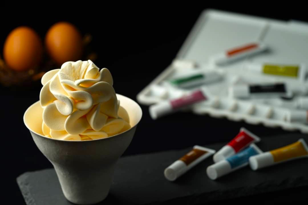 こちらの看板商品が、こだわりのプリンをミキサーで液状にして-8℃に冷やし、ソフトクリーム状に絞り出した「100%プリンソフト」。パレットをモチーフにしたトレイにのせられた商品には、1つにつき絵の具のチューブのような容器に入ったオリジナルソースが2つも付いてきます♪