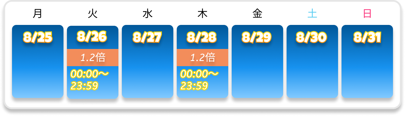 対象者には、2025/8/27(水)23:59と2025/8/29(金)23:59までにポイント加算いたします。