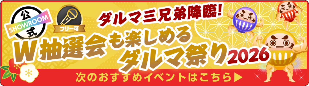 ・本イベントはSHOWROOM株式会社が運営しております。 ・下記注意事項およびSHOWROOM会員規約その他のルールを守って配信しましょう。 ・他者が嫌がるような迷惑行為はしないようにしましょう。 ・審査状況や選考基準に関するお問い合わせには基本的にお答えできかねます。 ・応募・審査通過等によって生じる権利を第三者に譲渡・質入等することはできません。特典の対象は獲得したルームの方のみです。特典を獲得したルームの方以外の方(グループ全体、グループメンバーなど)が特典を実施することは禁止といたします。 ・アバター、ギフティングアイテム等デジタルコンテンツの制作権を獲得された場合、SHOWROOM株式会社が作成する[ガイドライン]・[利用規約]に準じている作品の制作をお願いいたします。これらに違反している場合は、獲得したコンテンツをご利用いただけませんので十分ご注意ください。 ・本注意事項およびSHOWROOM会員規約その他のルールに違反した場合またはその他当社が不適切であると判断した場合は、応募及び結果を無効とし、または取り消す場合があります。 ・応募条件を全て満たさずにエントリーされた場合には、いかなる理由であってもエントリーを取り消し、特典の権利を無効とさせていただく可能性があります。 ・バーチャルライバーに関しては各人の世界観により定義された性別です。 ・イベントを途中離脱された場合には、いかなる理由であっても特典の権利を無効とさせていただきます。該当のライバーにギフティングされたリスナーへの返還、返金等もいたしかねますので、予めご了承ください。 ・金銭、物品、その他プレゼント(チェキ、お礼カードは除く)を視聴者に贈り応援を促進させる行為は禁止します。 ・重複アカウントによる応援は禁止です。重複アカウントによる応援ポイント分は発覚次第、減算を行います。なお、当サービスのセキュリティ上、対応や減算の仕組みの詳細に関しましては個別にご案内を差し上げておりません。予めご了承ください。 ・本アプリ内で開催されるキャンペーン・イベント・コンテスト等にアップル社、グーグル社は一切関係ありません。 ・天災、不慮の事故などのやむを得ない事情により特典履行が行えない場合、特典が変更・補填・中止となることがございます。予めご了承ください。 ・万が一、前項に定める事由による特典履行が変更、中止となった場合、その他本イベントの応援ポイントが取り消しされた場合であっても、SHOWROOM株式会社は当該応援ポイントにかかるデジタルコンテンツまたはShow Gold、現金その他の返還はいたしません。予めご了承ください。 ・イベント終了後に減算されてポイント未達成になった場合、特典は取り消しとさせていただく場合があります。 ・ランキングが関わるイベントの場合、グループメンバー同士(グループアカウント、個人アカウント問わず)、または、イベント参加者の関係者(マネージャー・プロデューサーなどの直接的な利害関係者)の応援はコメントのみ可能とし、有料ギフト・無料ギフトによる応援は禁止とさせていただきます。 ・公式ライバーの方が報酬のある特典を獲得された場合は、所属オーガナイザー・所属事務所等にご確認の上ご対応ください。