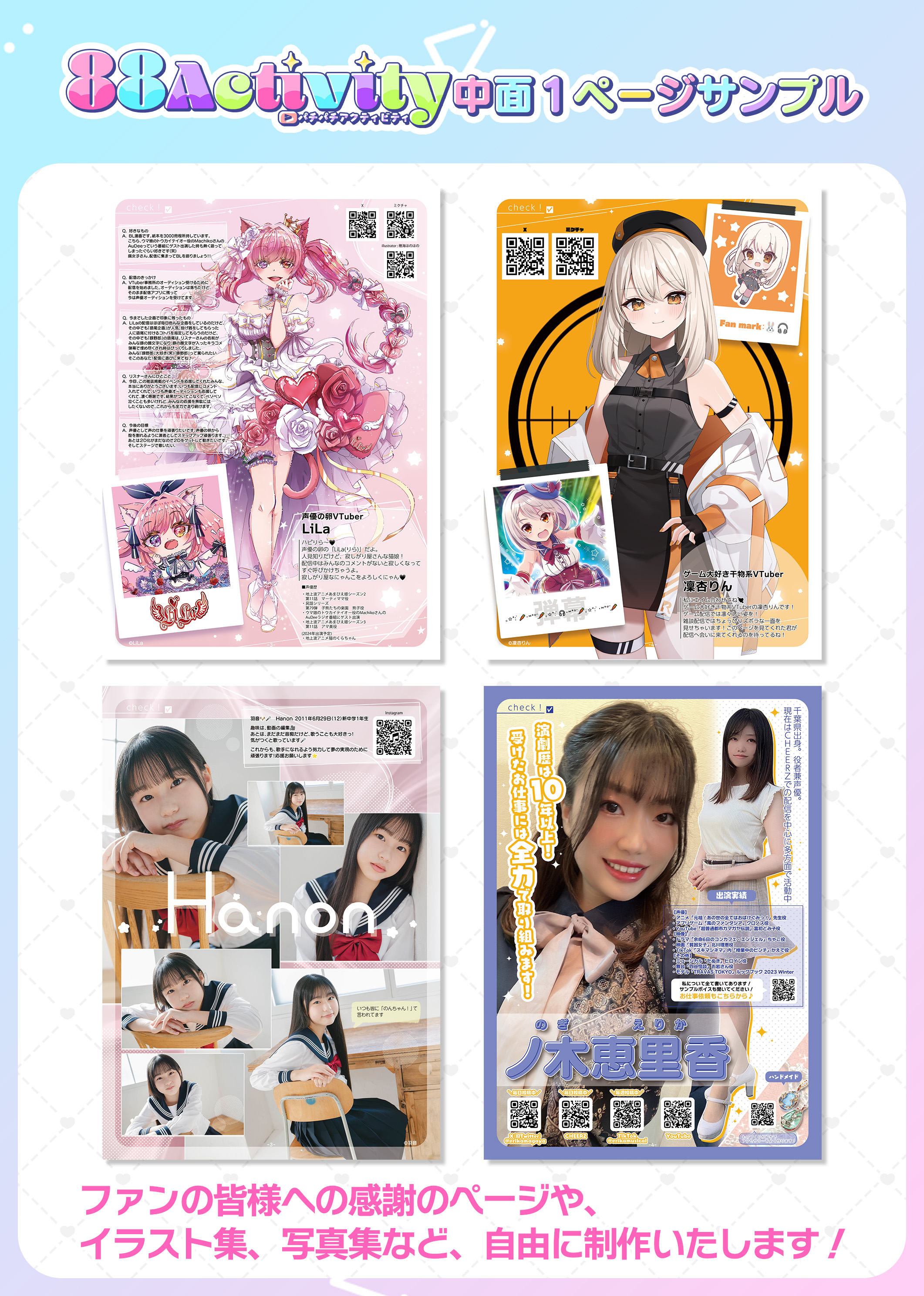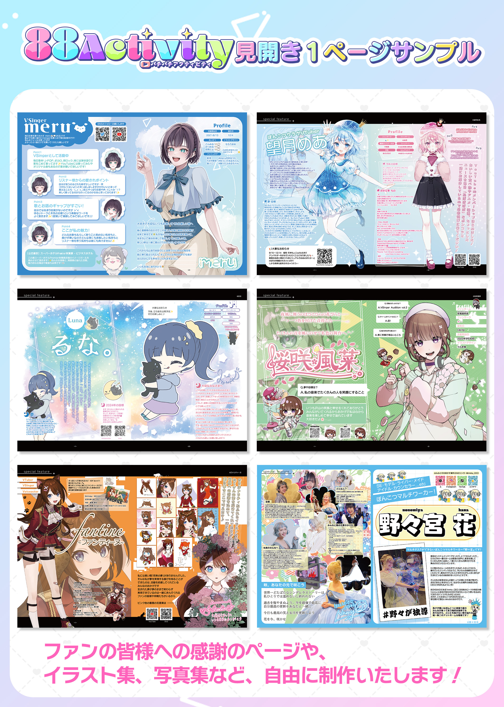 イラスト制作会社が様々なジャンルの活動者とともにお届けする、一緒に成長していく可愛い情報誌『88Activity(パチパチアクティビティ)』、2024/08/08(木)発行分の表紙と特集ページの見開き1Pを飾るモデルを決定するイベントです! 特集ページは、ファンの皆様への感謝のページや、イラスト集、写真集など、自由に制作いたします!活動ジャンルを問わず大募集です!ランキング2位と3位の方は、2024/08/08(木)発行分の中面1P掲載が付いてきますので、皆様のご参加をお待ちしております!