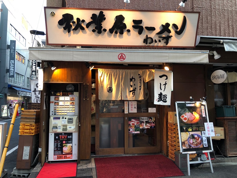 ▼東京メトロ・末広町駅より徒歩1分、蔵前橋通り沿いにある『秋葉原ラーメン わいず』。カウンター9席の小さなお店だけに、ランチタイムや週末は行列必至!