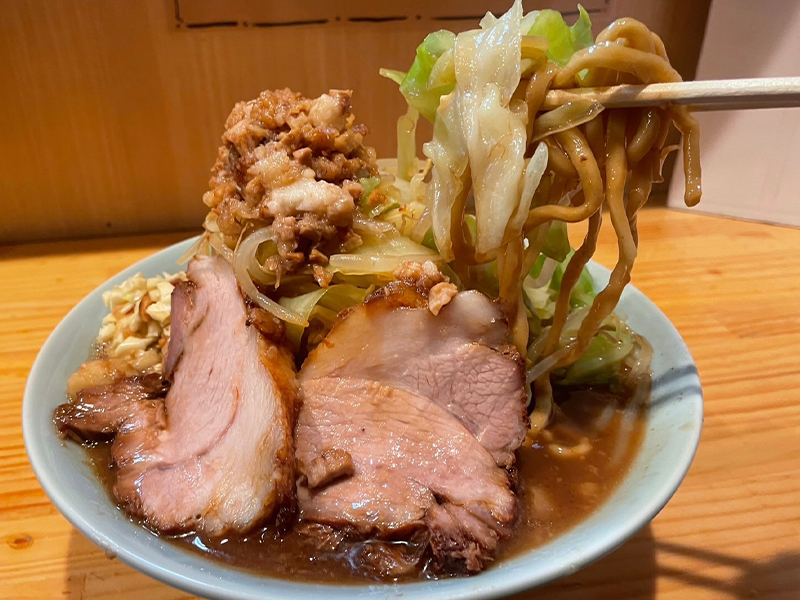 ▼試作と試食を重ねて2022年にやっとデビューした「わいずの豚そば」。コシの強い極太麵に分厚いチャーシュー、山盛り野菜、そしてたっぷりのニンニク。豚そばに合う甘みのある特製醤油も新たに開発した超力作です!