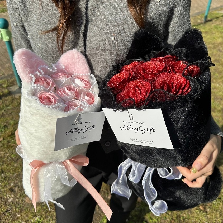 ソープフラワーや業界初のグリッターローズをメインに使用したワンホンブーケの専門花屋『AlleyGift』。『AlleyGift』は、ワンホンブーケのコンセプトを日本でいち早く広め、トレンドを作るデザイン力からTBS・日経新聞などのメディアに多数紹介されている花屋です。超キラキラするグリッターローズを使用したデザインが特徴で、TikTokやInstagramなどでも大きな話題となっています。「うさぎ」や「猫」をモチーフにしたふわふわ花束や、お手頃で扱いやすい「ミニ花束」など、幅広いデザインのワンホンブーケを開発しています。