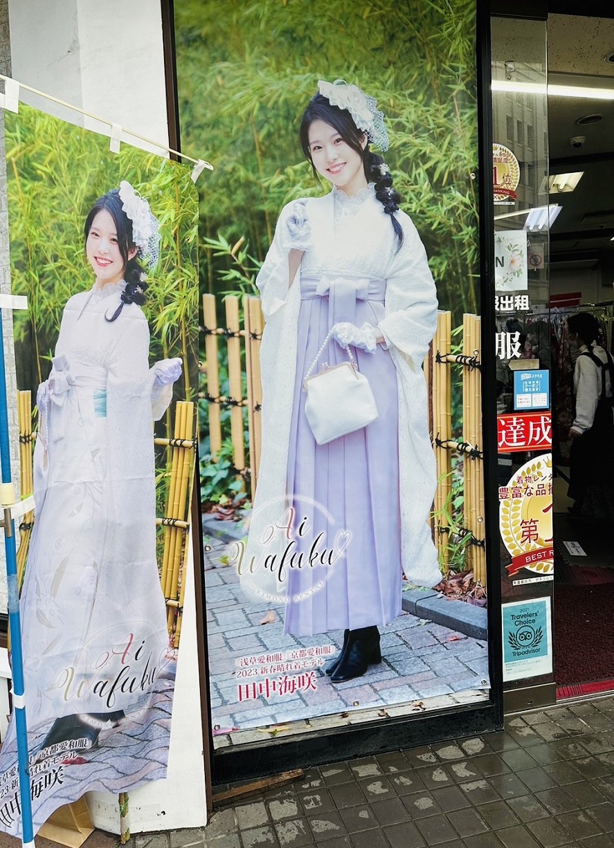 ▼晴れ着モデルに就任された「田中海咲」さんには、宣伝のぼりに加え、『浅草愛和服』3号店の店頭に設置された特大タペストリーにも登場していただいております!
