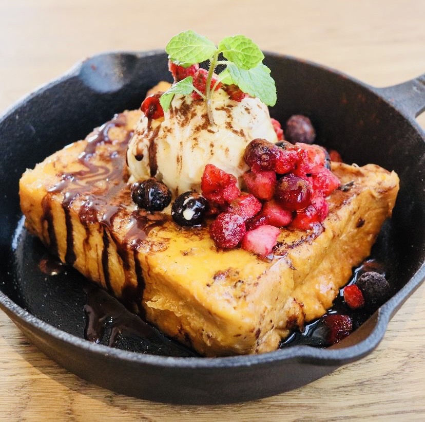 ▼フレンチトーストの表面をブリュレすることで外はパリっと、中はふんわりとした食感が楽しめる「ブリュレフレンチトースト」。濃厚アイスクリームに絡めてお召し上がりください♡