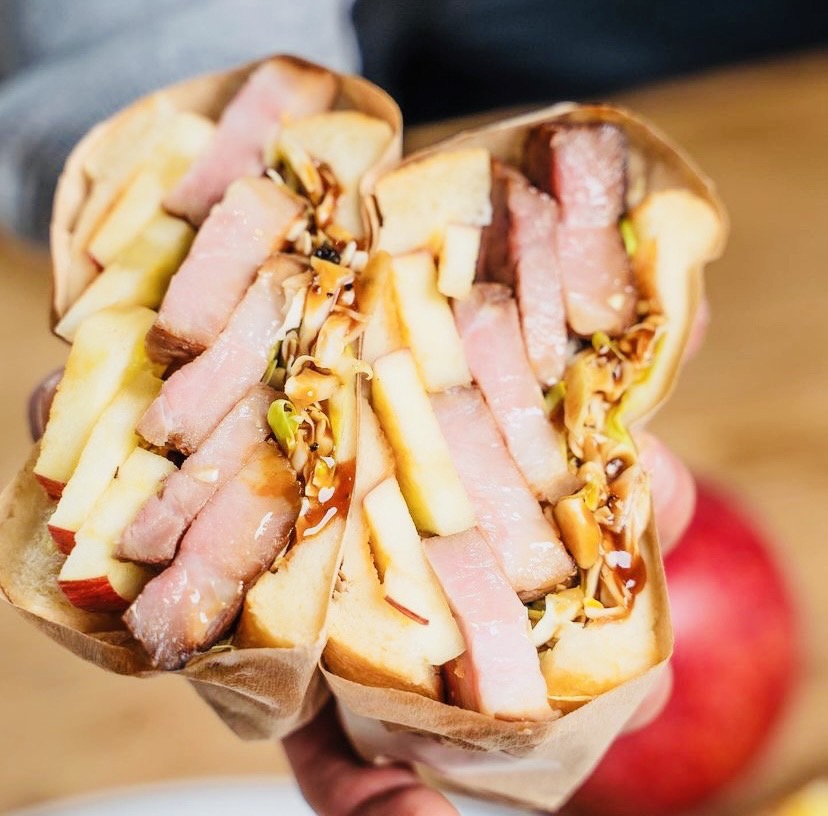 ▼低温調理器にオリジナルソースとお肉を入れて6時間煮詰めているため、味がしっかり染み込んでいる「ワイルドポークサンド」。お肉が柔らかく、アップルピクルスをアクセントに魅惑の味に大変身!