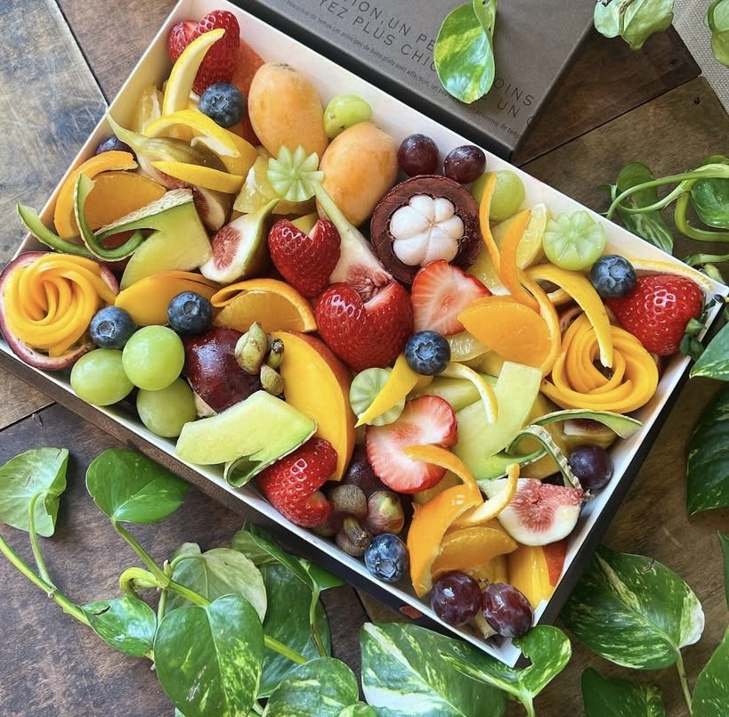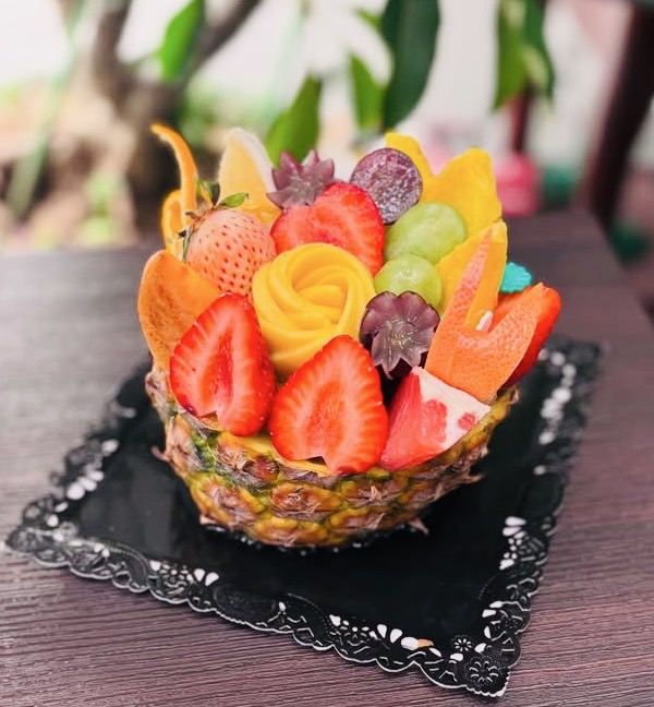 カッティングしたフルーツを花のように綺麗に盛り付けたギフトボックスをはじめ、フルーツパフェやフルーツサンド、フルーツスムージーなど、同氏が創り出す商品はまるで芸術品のよう。旬の食べごろフルーツを厳選して使用しているので、もちろん味や香りも折り紙つきです。