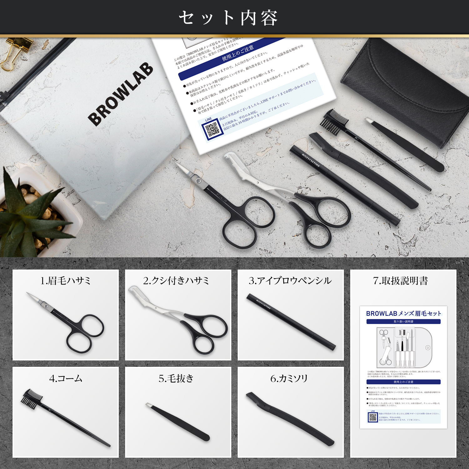 BROWLAB 眉毛は、マユハサミ×1、クシ付きハサミ×1本、毛抜き×1本、アイブロウペンシル×1本、カミソリ×1個、コーム×1個と眉毛を整えるために必要な全ての器具が揃っている市販の中でも最高峰レベルのコンプリートセットです。