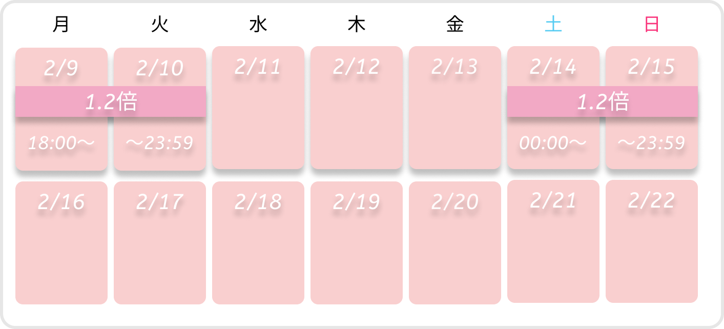 ※対象ルームには、各ボーナスデーの翌営業日23:59までにポイントが加算されます。(2/9(月)〜2/10(火)分は2/12(木)23:59までに加算、2/14(土)〜2/15(日)分は2/16(月)23:59までに加算)