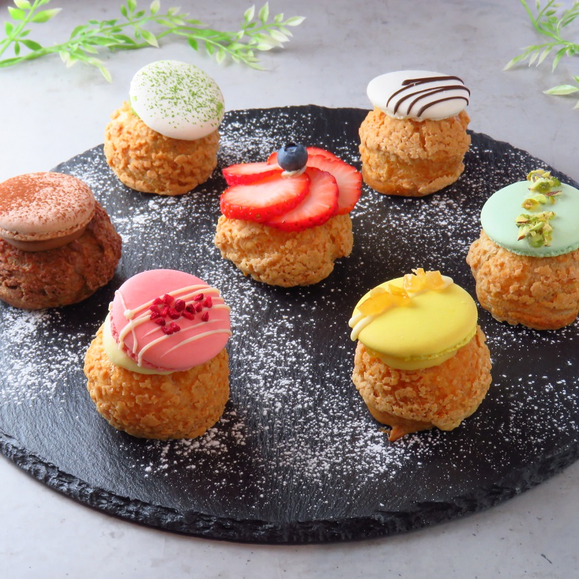 クッキー生地のシュークリームと甘いマカロンのサクサク食感、濃厚カスタードクリームのとろける食感が一度に楽しめる「シューマカロン」は、通常メニュー6種(バニラ・レモン・抹茶・ショコラ・ピスタチオ・苺)に期間限定メニュー1種を加えた全7種をラインナップ。他にも、パスタやピザなどの軽食も楽しむことができます。