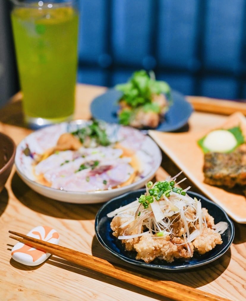 やわらかい照明と木目を基調とした落ち着きある店内では、焼酎やウイスキーなど10種のお酒と、煎茶やジャスミン茶、チャイなどのお茶10種の組み合わせからなる「100種のお茶割り」、ももやむね、かわなど10種の部位と、にんにく醤油、わさび、梅、柚子胡椒、ヤンニョムといった10種の味の組み合わせからなる「100種の唐揚げ」、旬の食材を使った豊富な創作料理などを存分に楽しむことができます。