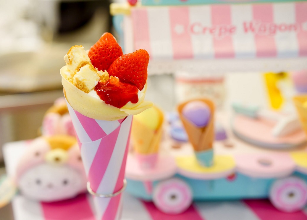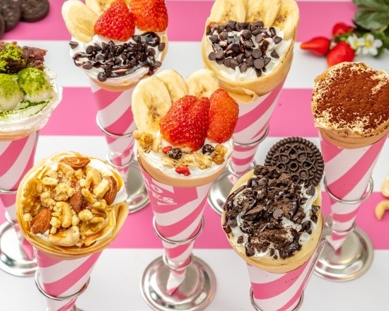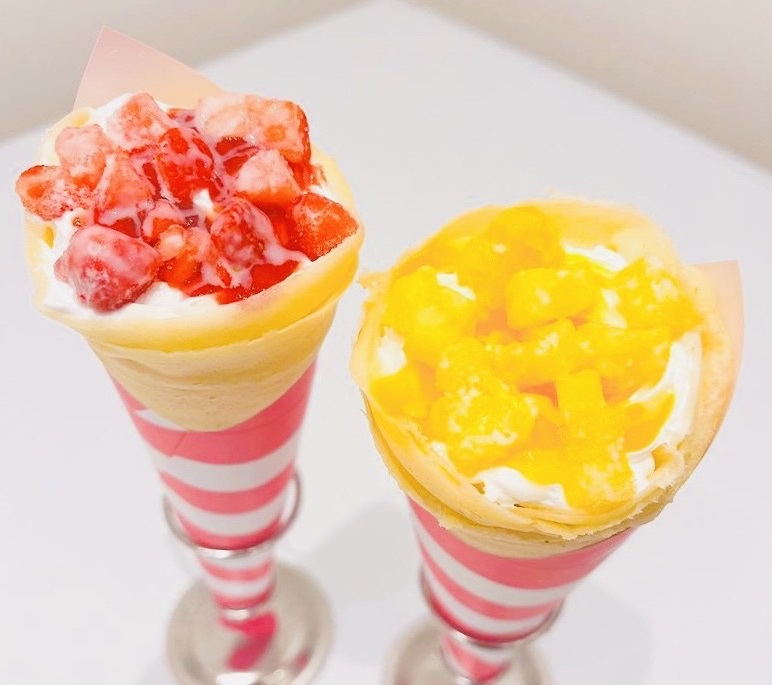 時間が経ってもモチモチの生地が自慢のクレープは、バナナチョコやいちごチョコといった定番から、いちごミルフィーユ、まるごといちごショート、キャラメルナッツパイといったスイーツ系、ずんだしらたま、いちごぜんざい、抹茶あずきしらたまといった和風系、BLT、ハムたまといったお惣菜系まで、バラエティあふれるラインナップ。また、山形産のさくらんぼや茨城産のメロン、山梨産のシャインマスカットなど季節の高級フルーツをふんだんに使った期間限定クレープも要チェックです。
