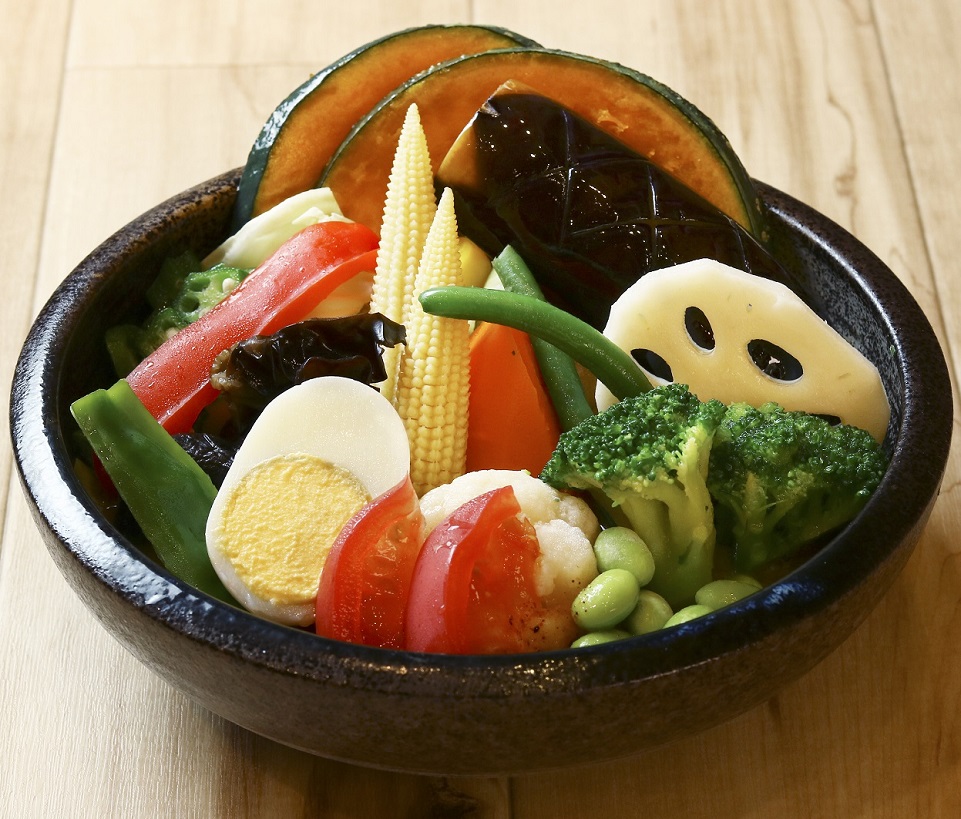 ▼彩りも豊かな「1日分の野菜スープカレー」。厚生労働省が推奨する、1日分の野菜摂取量350g(うち緑黄色野菜120g)がぎっしり入った大満足の1皿です♪