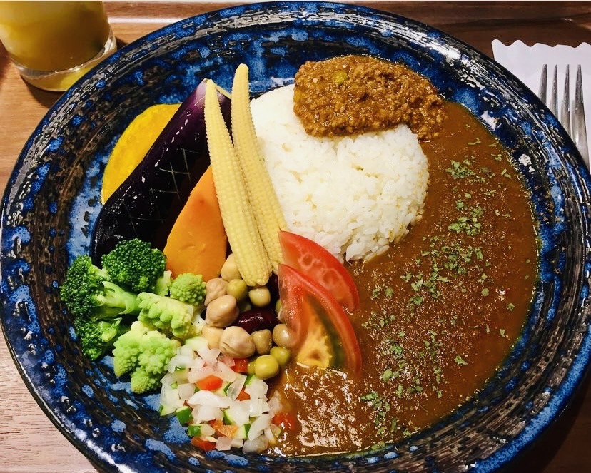 ▼男女問わず大人気の「ベジ・スパイスカレー」。キーマカレーも少しご飯にかかっているので、メインのお肉がなくても食べ応えあり☆もちろんお肉のトッピング(骨付きチキン・ハンバーグ・ラム肉・もち豚)も可能です♪