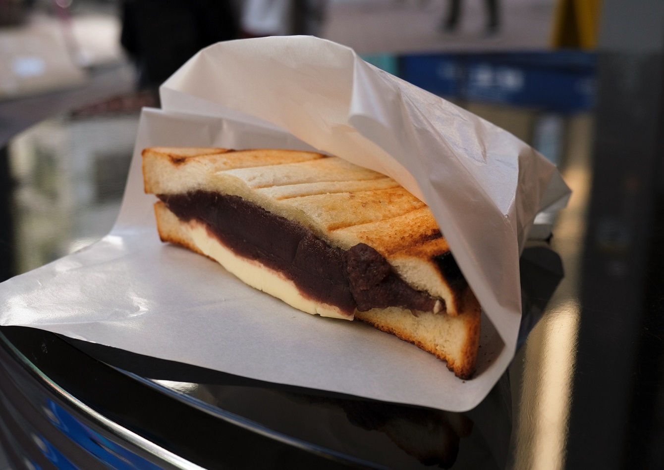 ▼人気の「あんバタークリームチーズホットサンド」。バター、餡子の深い甘味と「AMEYOKO REGULAR COFFEE」の酸味は相性抜群!