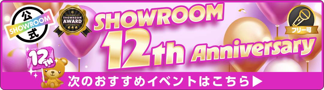 ・本イベントはSHOWROOM株式会社が運営しております。 ・下記注意事項およびSHOWROOM会員規約その他のルールを守って配信しましょう。 ・他者が嫌がるような迷惑行為はしないようにしましょう。 ・審査状況や選考基準に関するお問い合わせには基本的にお答えできかねます。 ・応募・審査通過等によって生じる権利を第三者に譲渡・質入等することはできません。特典の対象は獲得したルームの方のみです。特典を獲得したルームの方以外の方(グループ全体、グループメンバーなど)が特典を実施することは禁止といたします。 ・アバター、ギフティングアイテム等デジタルコンテンツの制作権を獲得された場合、SHOWROOM株式会社が作成する[ガイドライン]・[利用規約]に準じている作品の制作をお願いいたします。これらに違反している場合は、獲得したコンテンツをご利用いただけませんので十分ご注意ください。 ・本注意事項およびSHOWROOM会員規約その他のルールに違反した場合またはその他当社が不適切であると判断した場合は、応募及び結果を無効とし、または取り消す場合があります。 ・応募条件を全て満たさずにエントリーされた場合には、いかなる理由であってもエントリーを取り消し、特典の権利を無効とさせていただく可能性があります。 ・バーチャルライバーに関しては各人の世界観により定義された性別です。 ・イベントを途中離脱された場合には、いかなる理由であっても特典の権利を無効とさせていただきます。該当のライバーにギフティングされたリスナーへの返還、返金等もいたしかねますので、予めご了承ください。 ・金銭、物品、その他プレゼント(チェキ、お礼カードは除く)を視聴者に贈り応援を促進させる行為は禁止します。 ・重複アカウントによる応援は禁止です。重複アカウントによる応援ポイント分は発覚次第、減算を行います。なお、当サービスのセキュリティ上、対応や減算の仕組みの詳細に関しましては個別にご案内を差し上げておりません。予めご了承ください。 ・本アプリ内で開催されるキャンペーン・イベント・コンテスト等にアップル社、グーグル社は一切関係ありません。 ・天災、不慮の事故などのやむを得ない事情により特典履行が行えない場合、特典が変更・補填・中止となることがございます。予めご了承ください。 ・万が一、前項に定める事由による特典履行が変更、中止となった場合、その他本イベントの応援ポイントが取り消しされた場合であっても、SHOWROOM株式会社は当該応援ポイントにかかるデジタルコンテンツまたはShow Gold、現金その他の返還はいたしません。予めご了承ください。 ・イベント終了後に減算されてポイント未達成になった場合、特典は取り消しとさせていただく場合があります。 ・ランキングが関わるイベントの場合、グループメンバー同士(グループアカウント、個人アカウント問わず)、または、イベント参加者の関係者(マネージャー・プロデューサーなどの直接的な利害関係者)の応援はコメントのみ可能とし、有料ギフト・無料ギフトによる応援は禁止とさせていただきます。 ・公式ライバーの方が報酬のある特典を獲得された場合は、所属オーガナイザー・所属事務所等にご確認の上ご対応ください。