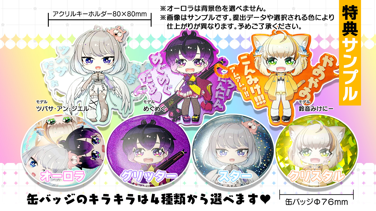 キラキラ可愛いアクリルキーホルダーと缶バッジが手に入る!