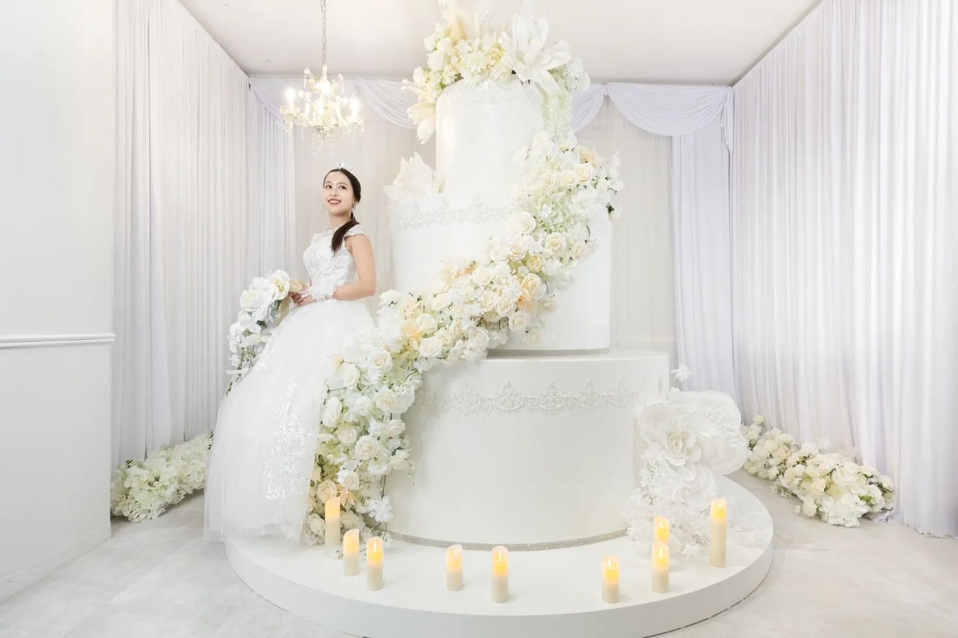 花に彩られた巨大なケーキ、デザイナー製作による時計台のインスタレーション、シルバーの巨大なバタフライ&黒漆喰壁、チャペルのようなアーチや白いオルガンといった素敵なシチュエーションで、あなたをエレガントなフェアリーに変身させちゃいます♪