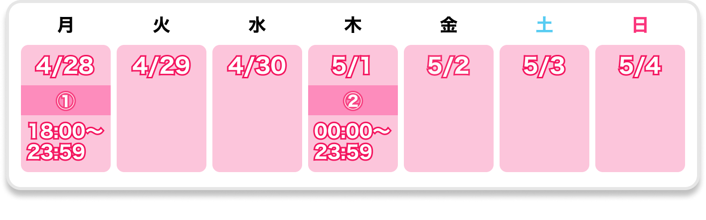 Monday, 28/04/2025 18:00 〜 Sunday, 04/05/2025 21:59