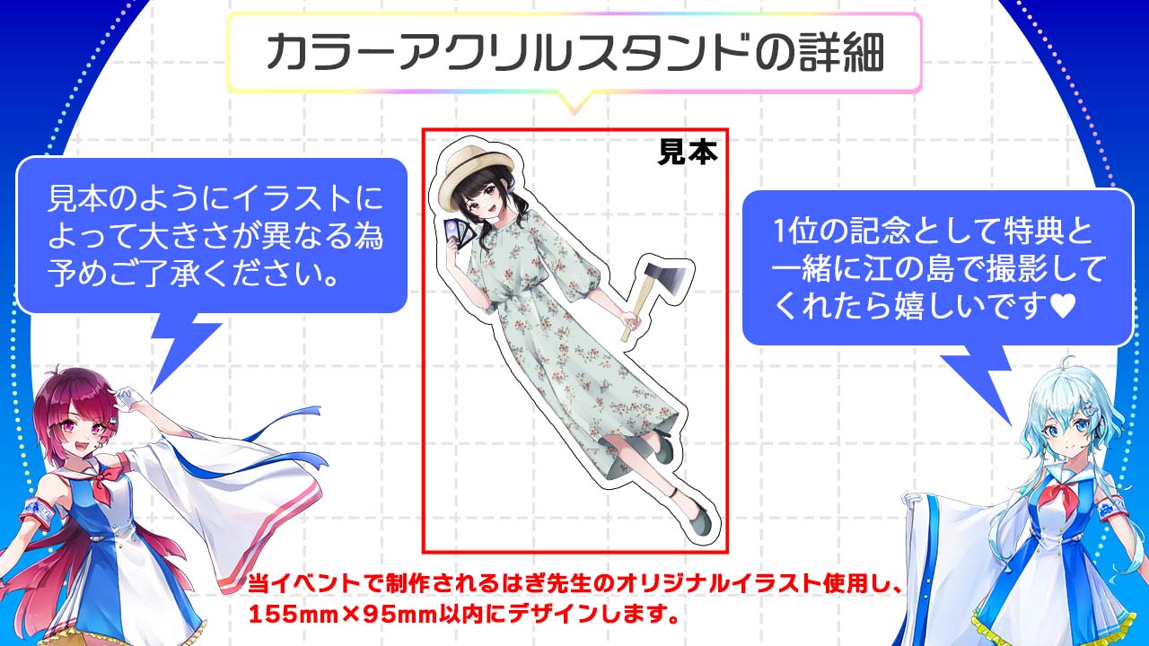 ・イベント特典には含まれていませんが、制作させていただいたランキング1位特典の看板は、過去に掲載のご協力をいただいた場所に申請させていただく予定です。申請が通らない場合もございますので、イベントによって掲載箇所が増減する可能性がございます。