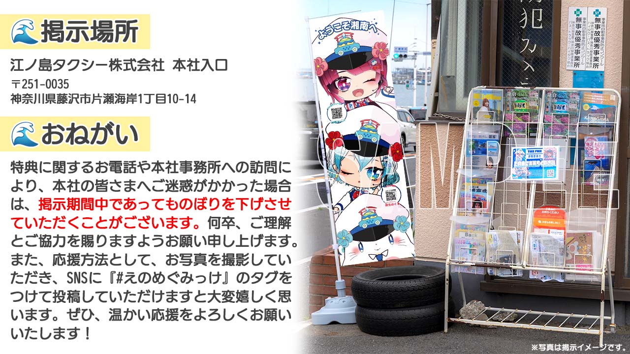・天候不良を除いた営業日の2026/05/15(金)から2026/06/11(木)の間、江ノ島タクシー株式会社本社(https://maps.app.goo.gl/S9kCJs7fi8XCrmTn7)にのぼりを設置します。