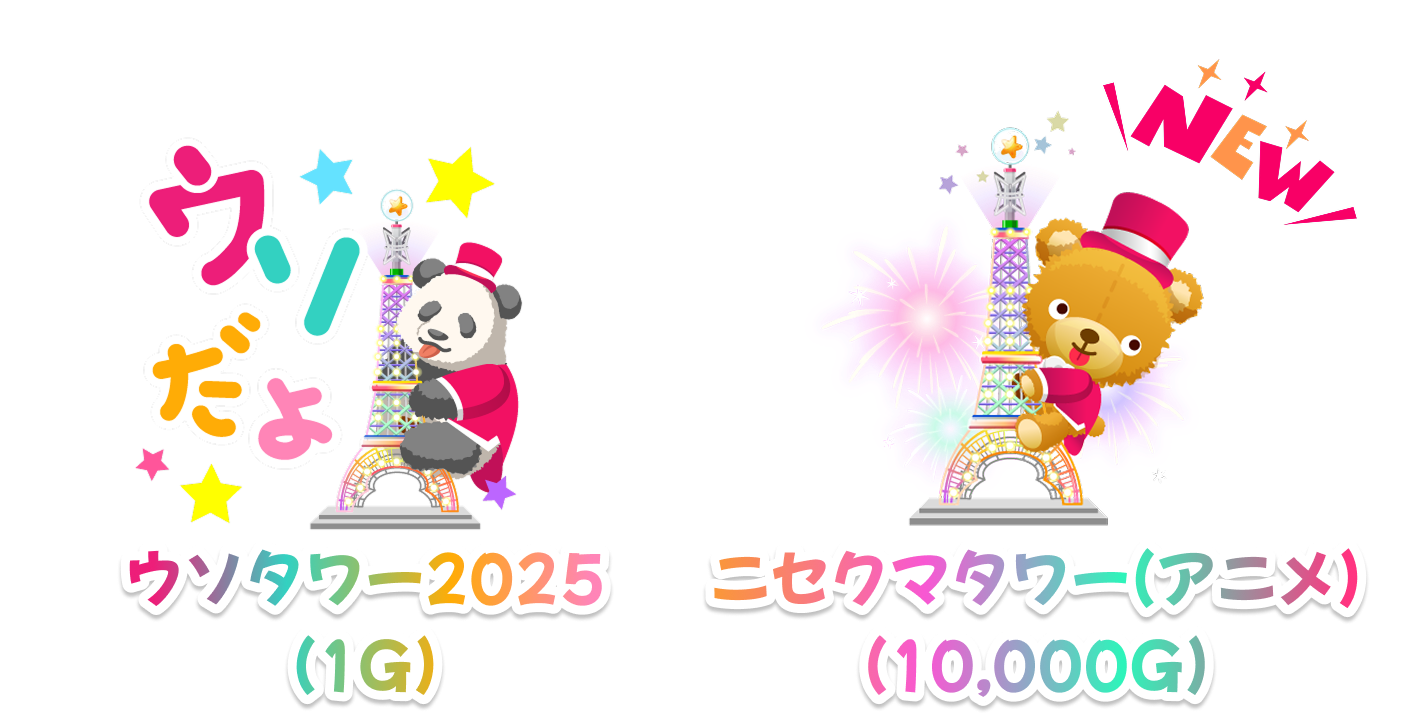 ※対象者には2025/4/1(火)にギフティングされた「ウソタワー2025」「ニセクマタワー(アニメ)」ギフトのポイントの1.2倍分を、2025/4/2(水)23:59までに加算いたします。