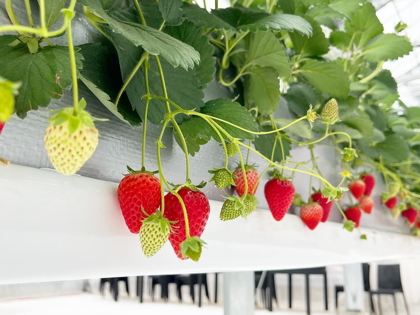 『空飛ぶいちご東京』では、いちごの培地を宙吊りにすることで培地を上下に動かせるため、手の届かない高さまでいちごを上げることができ、まさに四方八方いちごに囲まれた空間でいちごを堪能することができます。