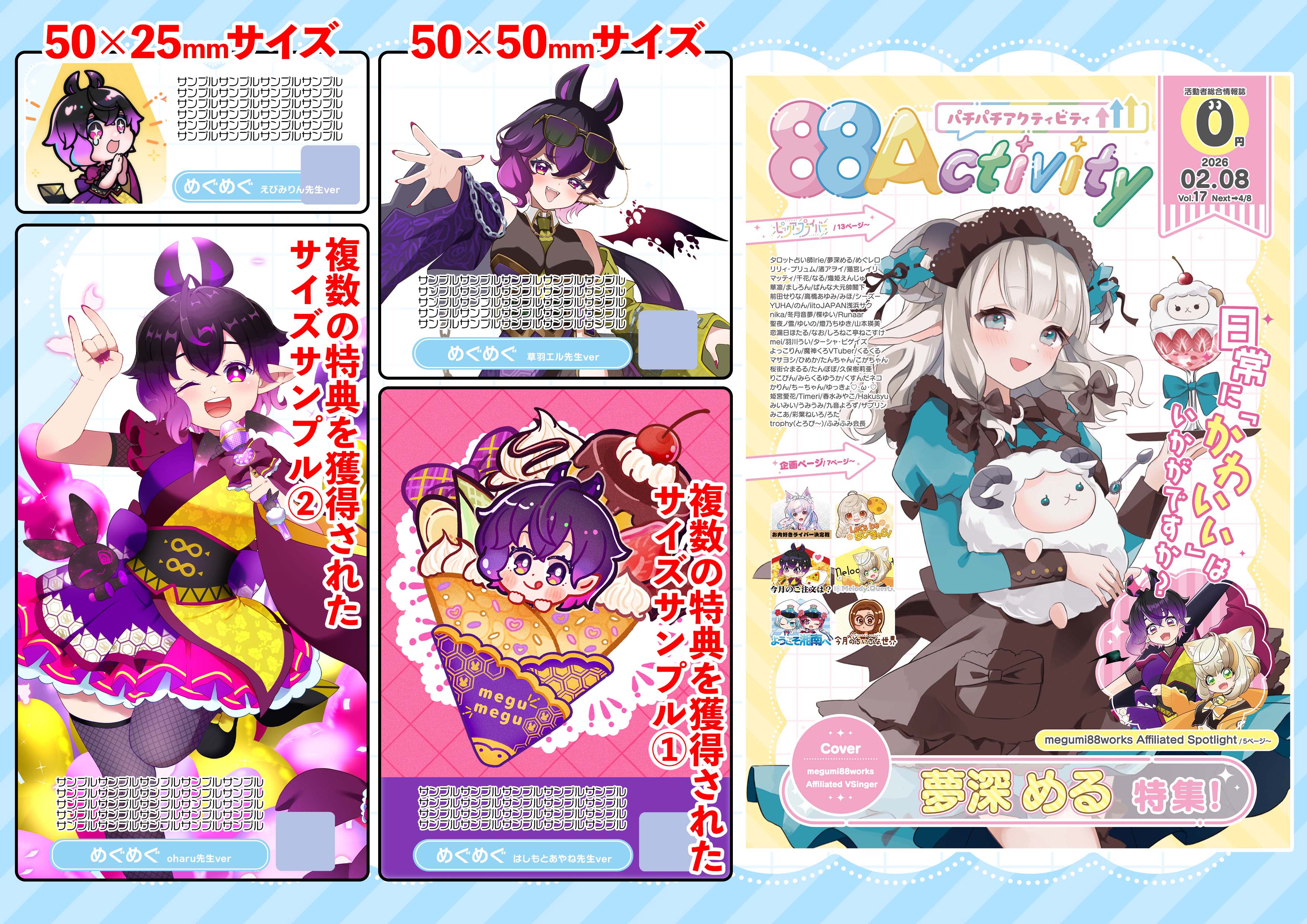 ライブやイベントで「もっと自分のスペースにグッズがあったらいいのに…」「グッズを作る時間も知識もないから不安…」そんなライバー様からの声にお応えして、megumi88worksからグッズ制作イベントを開催!ランキング1位~5位に、商用利用可能なオリジナルクリアステッカーをプレゼント!ご自分でグッズ制作を行いたい方向けに、材料費として使えるAmazonギフトカードも選択可能です! フリーペーパー『88Activity(パチパチアクティビティ)』の広告枠もゲットできます!活動にかわいさをプラスしたいライバー様、ぜひご参加ください!