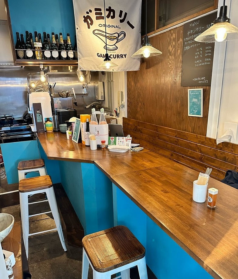 東急電鉄・三軒茶屋駅北口Bより徒歩5分、国道246号線沿いにある『ガミカリー』。伝説のヒップホップグループ「妄走族」の人気ラッパーとして活動していた「神(がみ)」がオーナーを務めるスパイスカリーの専門店です。