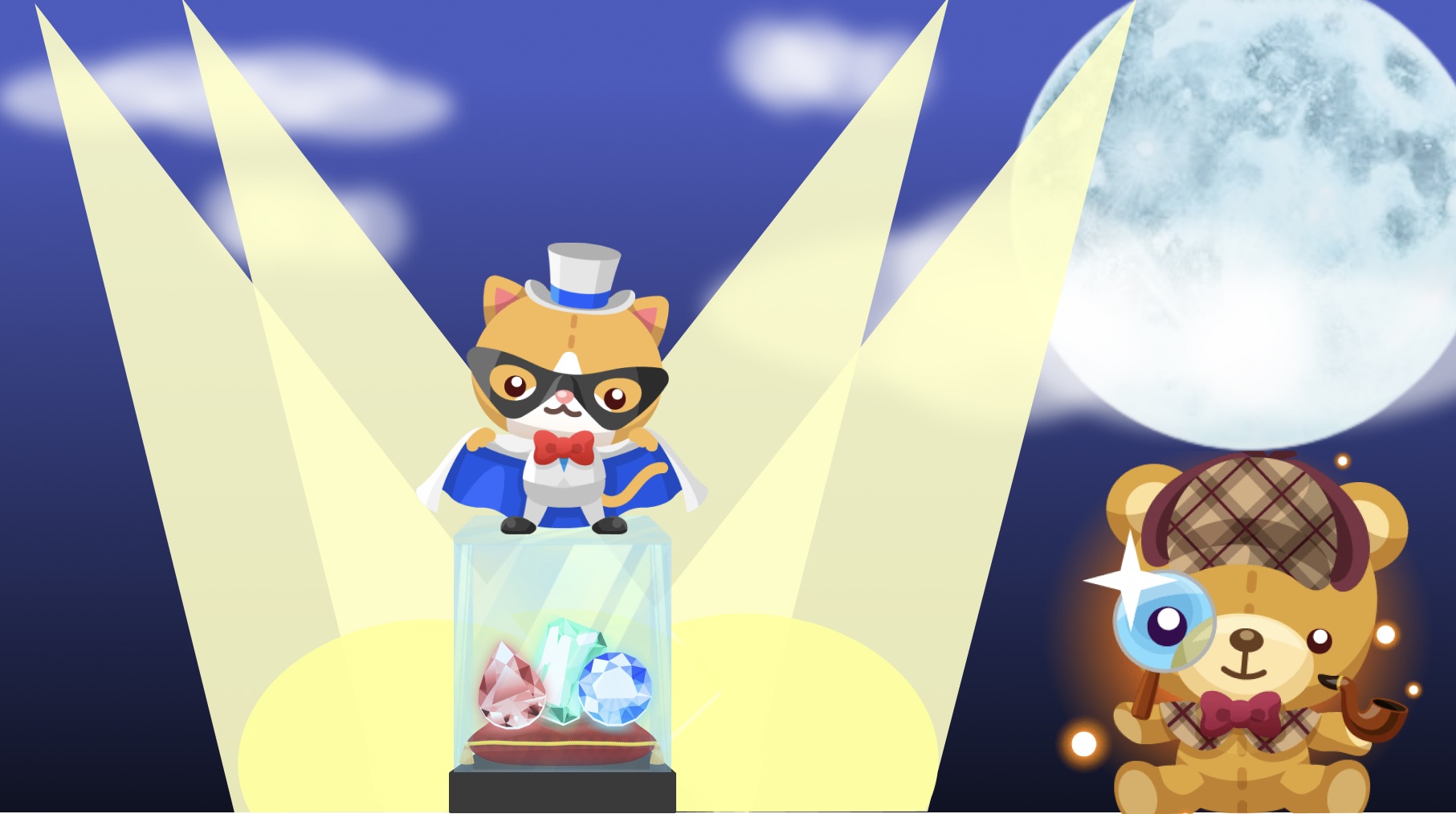 怪盗ネコと宝石ギフトがルームに登場したら名探偵クマをギフティングして、宝石を取り戻しましょう!