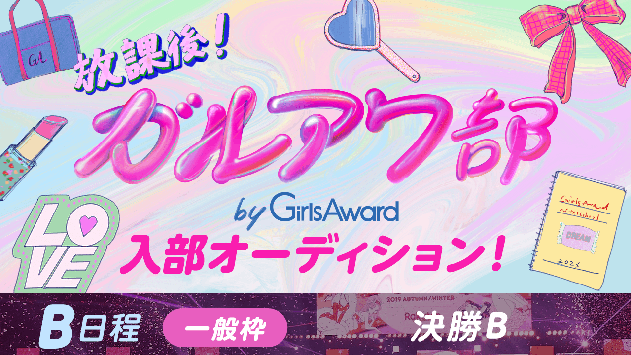 〜キミの手で、夢のトビラを切り開け〜 GirlsAward全⾯サポートのもと『放課後!ガルアワ部』が設立決定! 『放課後!ガルアワ部』のメンバーになると、GirlsAwardでのランウェイ出演など夢の⼀歩を踏みだすためのチャンスが盛りだくさん!