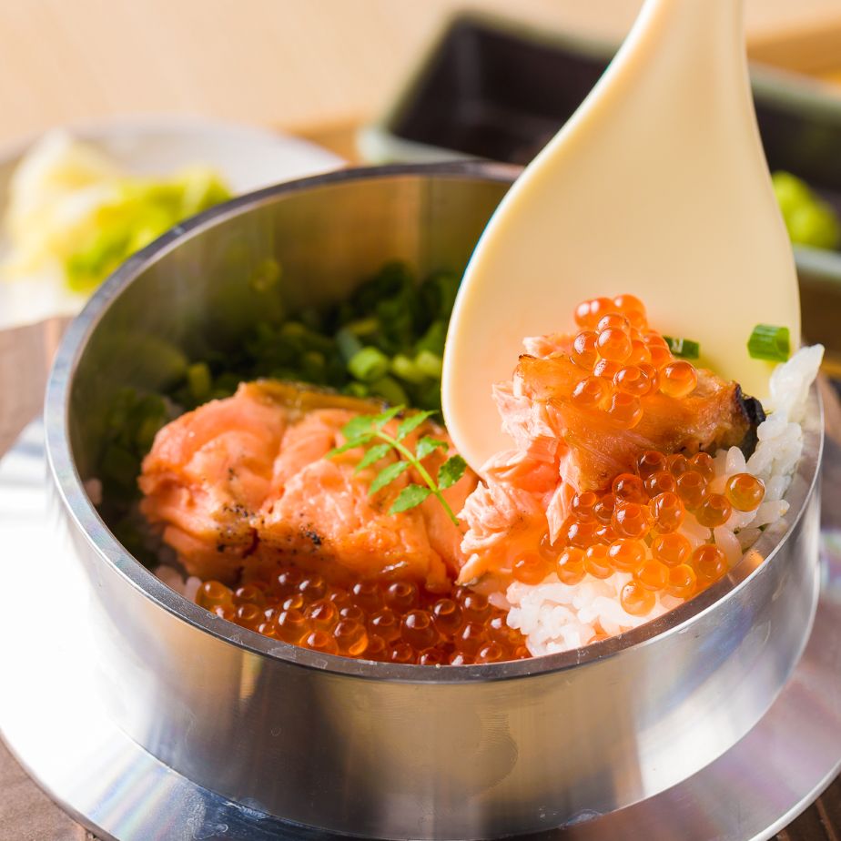 ▼京都の老舗米屋「八代目儀兵衛」の極上米を使用し、ふっくらと艶やかに炊き上げる釜めし。味の決め手は、自家製のあご出汁。焼きあごの上品でまろやかな旨みが米一粒一粒に染み渡り、香りと味わいの奥行きを演出します。※写真は「銀鮭といくらの釜めし」