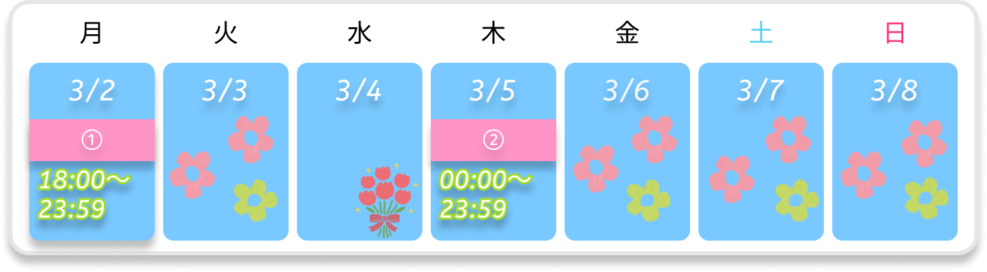 ハルラン①:2026/3/2(月)18:00〜23:59ハルラン②:2026/3/5(木)0:00〜23:59